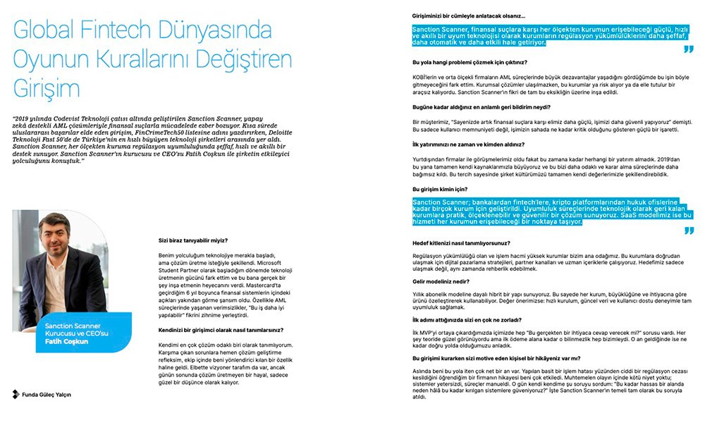 “2019 yılında Codevist Teknoloji çatısı altında geliştirilen Sanction Scanner, yapay zekâ destekli AML çözümleriyle finansal suçlarla mücadelede ezber bozuyor. Kısa sürede uluslararası başarılar elde eden girişim, FinCrimeTech50 listesine adını yazdırırken, Deloitte Teknoloji Fast 50’de de Türkiye’nin en hızlı büyüyen teknoloji şirketleri arasında yer aldı. Sanction Scanner, her ölçekten kuruma regülasyon uyumluluğunda şeffaf, hızlı ve akıllı bir destek sunuyor. Sanction Scanner’ın kurucusu ve CEO’su Fatih Coşkun ile şirketin etkileyici yolculuğunu konuştuk.”
