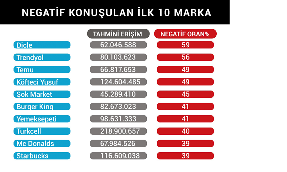 DİR100 Raporu’nda negatif konuşulma oranlarına göre sıralanan ilk 10 marka arasında %59 ile Dicle Elektrik, %56 ile Trendyol, %49 ile ise Temu ve Köfteci Yusuf dikkat çekti. E-ticaretten hızlı tüketime, iletişimden yemek platformlarına uzanan geniş bir sektör yelpazesinde yer alan bu markalar, yüksek erişim oranlarına sahip olmalarına rağmen dijital ortamda maruz kaldıkları olumsuz algının ne kadar etkili ve yaygın olabileceğini gözler önüne serdi.