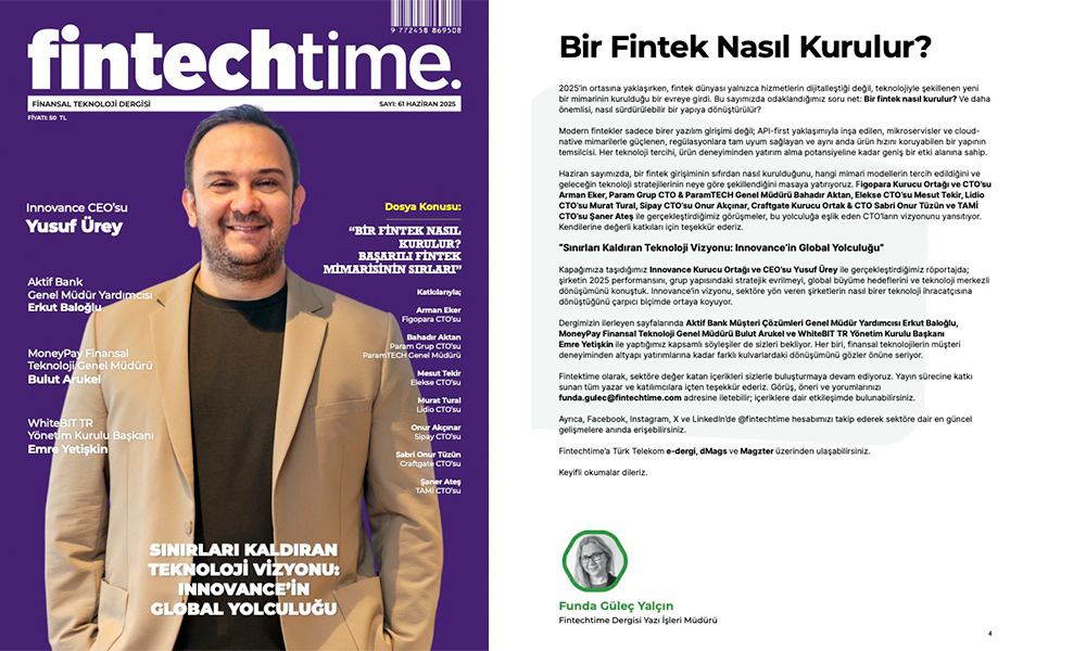 Haziran sayımızda, bir fintek girişiminin sıfırdan nasıl kurulduğunu, hangi mimari modellerin tercih edildiğini ve geleceğin teknoloji stratejilerinin neye göre şekillendiğini masaya yatırıyoruz. Figopara Kurucu Ortağı ve CTO’su Arman Eker, Param Grup CTO & ParamTECH Genel Müdürü Bahadır Aktan, Elekse CTO’su Mesut Tekir, Lidio CTO’su Murat Tural, Sipay CTO’su Onur Akçınar, Craftgate Kurucu Ortak & CTO Sabri Onur Tüzün ve TAMİ CTO’su Şaner Ateş ile gerçekleştirdiğimiz görüşmeler, bu yolculuğa eşlik eden CTO’ların vizyonunu yansıtıyor. Kendilerine değerli katkıları için teşekkür ederiz.