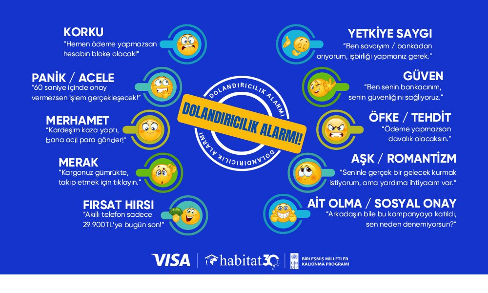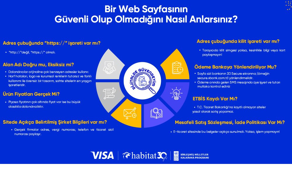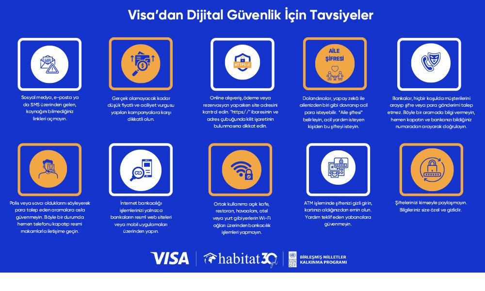 UNDP Türkiye, Programdan Sorumlu Mukim Temsilci Yardımcısı ise, “Güvenli dijital ortamlar, bireylerin bilgi edinme ve beceri geliştirme süreçlerini destekleyerek insani gelişmeyi hızlandırıyor. Dolayısıyla, toplumsal dayanıklılığı artırarak krizlere karşı direnci güçlendiriyor. Visa ve Habitat Derneği ile başlattığımız bu yeni faaliyet, bu hedefi somut bir adıma dönüştürmeyi amaçlıyor. Dolandırıcılığa karşı uzun yıllardır teknolojik yatırımlar yapan Visa’ya, katkıları için teşekkürlerimizi sunarız. Proje, Visa’nın derin bilgi birikimiyle şekillendi ve saha eğitimleri Habitat’ın uzmanlığıyla gerçekleştirilecek” ifadelerini kullandı.