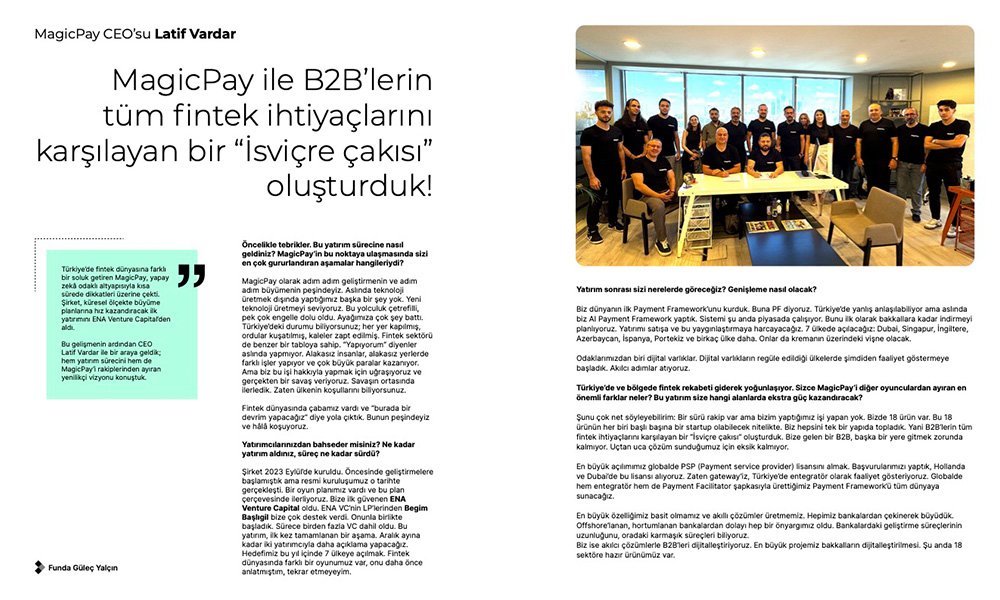 “Türkiye’de fintek dünyasına farklı bir soluk getiren MagicPay, yapay zekâ odaklı altyapısıyla kısa sürede dikkatleri üzerine çekti. Şirket, küresel ölçekte büyüme planlarına hız kazandıracak ilk yatırımını ENA Venture Capital’den aldı. Bu gelişmenin ardından CEO Latif Vardar ile bir araya geldik; hem yatırım sürecini hem de MagicPay’i rakiplerinden ayıran yenilikçi vizyonu konuştuk.”