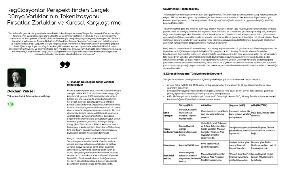 Yüksel Avukatlık Bürosu Kurucu Ortağı Gökhan Yüksel, Fintechtime Eylül sayısı için yazdı “Regülasyonlar Perspektifinden Gerçek Dünya Varlıklarının Tokenizasyonu: Fırsatlar, Zorluklar ve Küresel Karşılaştırma.”