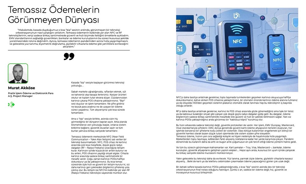 “Makalemde, kasada duyduğumuz o kısa “bip” sesinin ardında, görünmeyen bir teknoloji orkestrasyonunun nasıl çalıştığını anlattım. Temassız ödemenin kalbinde yer alan NFC ve RF teknolojilerinin, veriyi sadece birkaç santimetrede güvenli ve hızlı biçimde ilettiğini örneklerle açıkladım. EMV standartlarının sağladığı güvenlikten, bankalar ve ödeme kuruluşlarının bu süreci kusursuz şekilde yürütmesindeki rolüne değindim. Ayrıca, temassız ödemenin pandemiden sonra hızla yaygınlaşmasını ve gelecekte yüz tanıma, biyometrik doğrulama, giyilebilir cihazlarla ödeme gibi yeniliklere evrileceğini aktardım.”