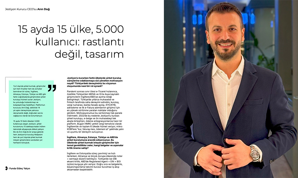 “Yurt dışında şirket kurmak, girişimciler için hem fırsatlar hem de zorluklar barındıran bir süreç. İngiltere, Almanya, Estonya, Türkiye ve ABD gibi farklı coğrafyalarda girişimcilere şirket kuruluşu hizmeti sunan Jestiyon, bu yolculuğu hızlandırmayı ve kolaylaştırmayı hedefliyor. Platformun kurucusu Arın Dağ, sektörde 14 yılı aşkın deneyimiyle yalnızca danışmanlık değil, doğrudan servis sağlayıcısı olarak da konumlanıyor. 15 ayda 15 farklı ülkeden 5.000 kullanıcıya ulaşan Jestiyon, şirket kurulumunu 15 dakikaya kadar indiren teknolojik altyapısıyla dikkat çekiyor.