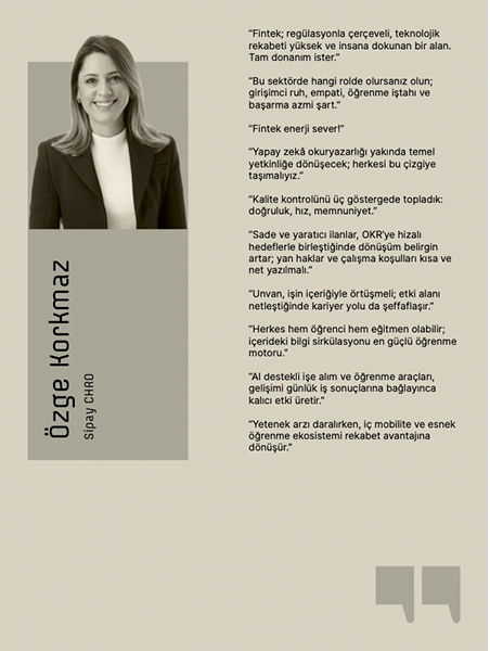 Fintekte büyüme hızı teknoloji kadar insanın esnekliğine bağlı hale geliyor. Otomasyon iş yükünü azaltırken, kararların kalitesi insanın sezgisi ve açıklanabilir uygulamalarla güç kazanıyor. Şirketler yeni unvanlar açıyor, ekiplerini yeniden kurguluyor ve iç mobiliteyi stratejik bir araç olarak görüyor. Bu dosya, yükselen rolleri, aranan becerileri ve önümüzdeki on iki ayın işe alım yol haritasını somut örneklerle ortaya koyuyor. Bu ay kaleme aldığımız “Fintekte İnsan Kaynağı” dosyasında, Sipay CHRO’su Özge Korkmaz’ın görüşleri; yaklaşık 300 kişilik, genç ve hibrit bir yapıda AI tabanlı işe alım (ATS + yapay zekâ mülakatları), OKR destekli performans ve AI Coach’lu öğrenme gibi uygulamalarla beceri–odaklı bir modeli ortaya koyuyor. Korkmaz, pozisyon sıralamasından çok yapay zekâ okuryazarlığı, etkin iletişim, çeviklik, analitik düşünme ve takım oyunu gibi yetkinliklere dikkat çekiyor; unvan mimarisinde piyasa gerçekliğini gözeten şeffaf kademelendirmeyi, iç mobilitede değerlendirme merkezi verisiyle global/yerel geçişleri ve 90 gün planında kültür uyumu + erken değer üretimi hedeflerini öne çıkarıyor. Sipay, “ünvan değil etki alanı” yaklaşımıyla, insan–YZ ortaklığını günlük akışlara yedirerek büyüyor.”