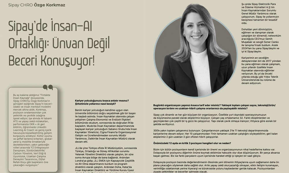 Fintekte büyüme hızı teknoloji kadar insanın esnekliğine bağlı hale geliyor. Otomasyon iş yükünü azaltırken, kararların kalitesi insanın sezgisi ve açıklanabilir uygulamalarla güç kazanıyor. Şirketler yeni unvanlar açıyor, ekiplerini yeniden kurguluyor ve iç mobiliteyi stratejik bir araç olarak görüyor. Bu dosya, yükselen rolleri, aranan becerileri ve önümüzdeki on iki ayın işe alım yol haritasını somut örneklerle ortaya koyuyor. Bu ay kaleme aldığımız “Fintekte İnsan Kaynağı” dosyasında, Sipay CHRO’su Özge Korkmaz’ın görüşleri; yaklaşık 300 kişilik, genç ve hibrit bir yapıda AI tabanlı işe alım (ATS + yapay zekâ mülakatları), OKR destekli performans ve AI Coach’lu öğrenme gibi uygulamalarla beceri–odaklı bir modeli ortaya koyuyor. Korkmaz, pozisyon sıralamasından çok yapay zekâ okuryazarlığı, etkin iletişim, çeviklik, analitik düşünme ve takım oyunu gibi yetkinliklere dikkat çekiyor; unvan mimarisinde piyasa gerçekliğini gözeten şeffaf kademelendirmeyi, iç mobilitede değerlendirme merkezi verisiyle global/yerel geçişleri ve 90 gün planında kültür uyumu + erken değer üretimi hedeflerini öne çıkarıyor. Sipay, “ünvan değil etki alanı” yaklaşımıyla, insan–YZ ortaklığını günlük akışlara yedirerek büyüyor.”