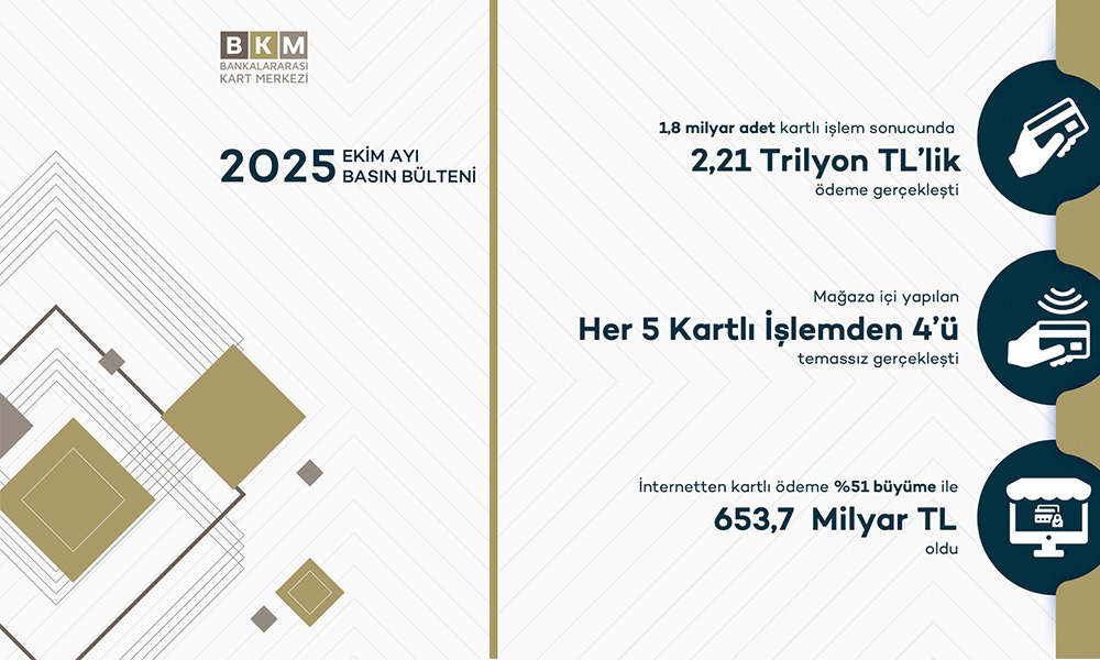 BKM’nin Ekim 2025 verileri, Türkiye’de kartlı ödeme ekosisteminin güçlü, genişleyen ve dijitalleşen bir yol izlediğini net biçimde ortaya koyuyor. Kartlı ödeme tutarı, işlem hacmi ve temassız kullanım oranı rekor seviyelere ulaşırken, internet ödemelerinde de çift haneli büyüme devam ediyor. Açıklanan aşağıdaki tablolar, 2026’ya girerken ödeme dünyasında güven, hız ve dijital konforun belirleyici olmaya devam edeceğini gösteriyor.