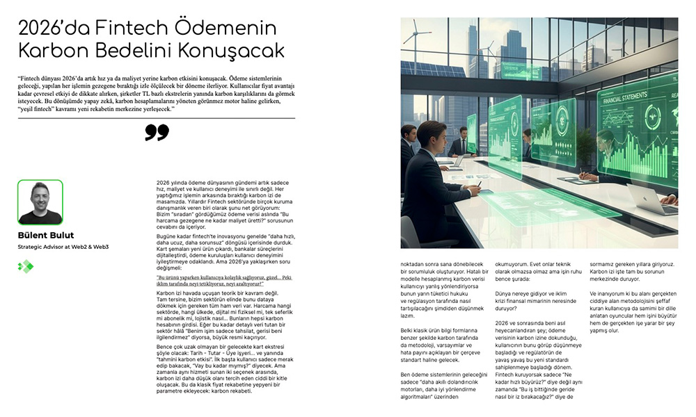 Strategic Advisor at Web2 & Web3 Bülent Bulut, Fintechtime Aralık sayısı için yazdı “2026’da Fintech Ödemenin Karbon Bedelini Konuşacak”.