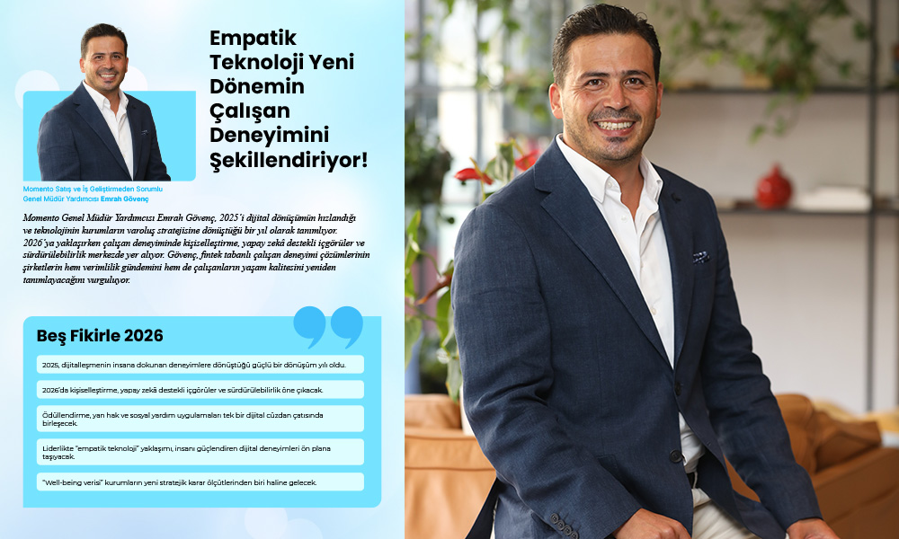 Momento Genel Müdür Yardımcısı Emrah Gövenç, 2025’i dijital dönüşümün hızlandığı ve teknolojinin kurumların varoluş stratejisine dönüştüğü bir yıl olarak tanımlıyor. 2026’ya yaklaşırken çalışan deneyiminde kişiselleştirme, yapay zekâ destekli içgörüler ve sürdürülebilirlik merkezde yer alıyor. Gövenç, fintek tabanlı çalışan deneyimi çözümlerinin şirketlerin hem verimlilik gündemini hem de çalışanların yaşam kalitesini yeniden tanımlayacağını vurguluyor.