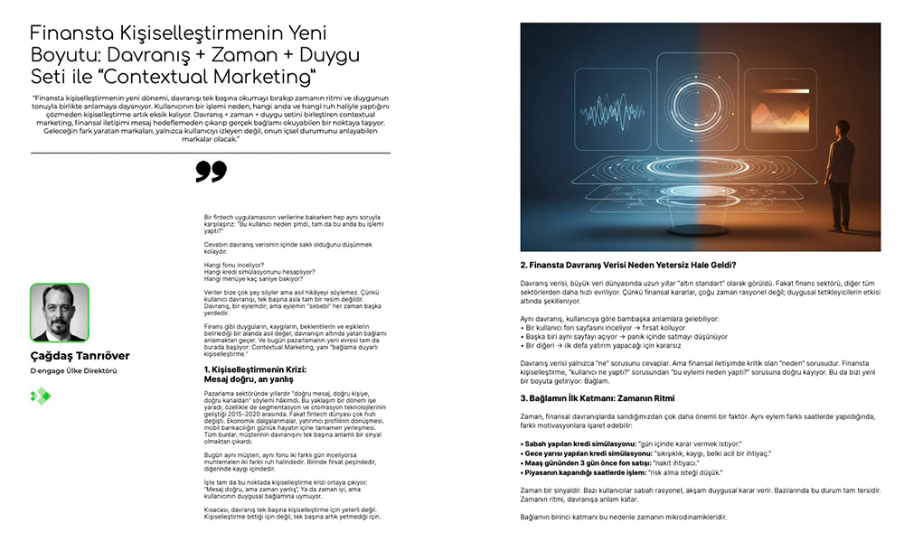 Dengage Ülke Direktörü Çağdaş Tanrıöver, Fintechtime Aralık sayısı için yazdı “Finansta Kişiselleştirmenin Yeni Boyutu: Davranış + Zaman + Duygu Seti ile “Contextual Marketing”.