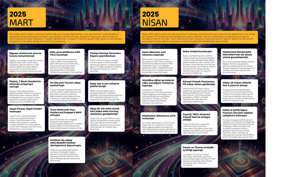 Mart 2025, yatırım iştahının yeniden şekillendiği, yerli–küresel platformların ürün lansmanlarını hızlandırdığı ve regülasyon tarafında stratejik adımların öne çıktığı bir dönem olmuştu. Büyük fon duyuruları, satın almalar ve teknik yetkilendirmeler ekosistemin ölçeğini genişletirken, Türkiye’nin teknoloji girişimciliği vizyonunu destekleyen programların da dikkat çektiği dinamik bir ay yaşanmıştı.