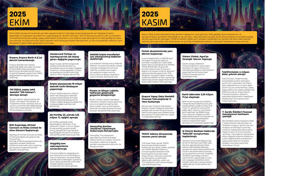 Ekim 2025, bankacılık tarafında yeniden yapılanmaların hızlandığı, kripto piyasasında sert dalgalanmaların yaşandığı ve regülasyon gündeminin yoğunlaştığı bir dönem olmuştu. Yerli fintek oyuncularının yeni iş modelleri ve ortaklıklarla sahaya çıktığı, yapay zekâ tabanlı çözümlerin ürün tasarımında daha görünür hale geldiği bir tablo öne çıkmıştı. Ay boyunca hem lisans kararları hem de büyük ölçekli dönüşümler, yıl sonuna giderken sektörün yeni dengelerini işaret eden gelişmeler sunmuştu.