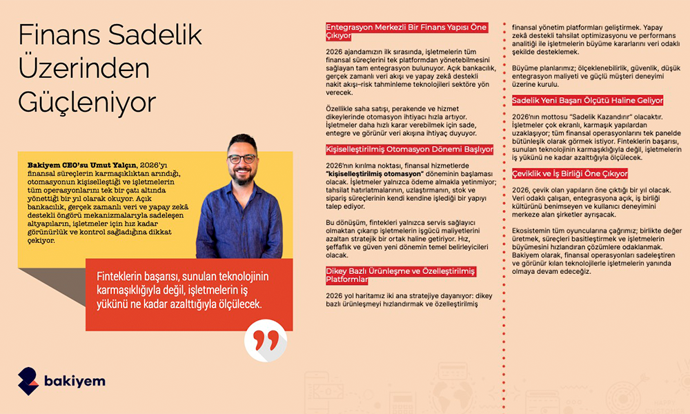“Bakiyem CEO’su Umut Yalçın, 2026’yı finansal süreçlerin karmaşıklıktan arındığı, otomasyonun kişiselleştiği ve işletmelerin tüm operasyonlarını tek bir çatı altında yönettiği bir yıl olarak okuyor. Açık bankacılık, gerçek zamanlı veri ve yapay zekâ destekli öngörü mekanizmalarıyla sadeleşen altyapıların, işletmeler için hız kadar görünürlük ve kontrol sağladığına dikkat çekiyor.”