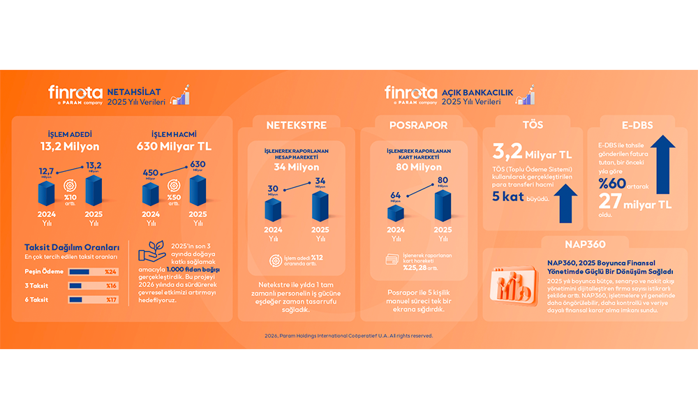 “2025 yılını, Netahsilat ve açık bankacılık çözümlerimizle elde ettiğimiz güçlü büyüme ve dijital finansal dönüşüm pazarındaki öncü konumumuzu pekiştiren sonuçlarla tamamladık. Yıl boyunca yakaladığımız başarı, Finrota’nın yalnızca teknoloji üreten değil; işletmelerin finansal süreçlerine stratejik değer katan bir iş ortağı olduğunu bir kez daha gösterdi.