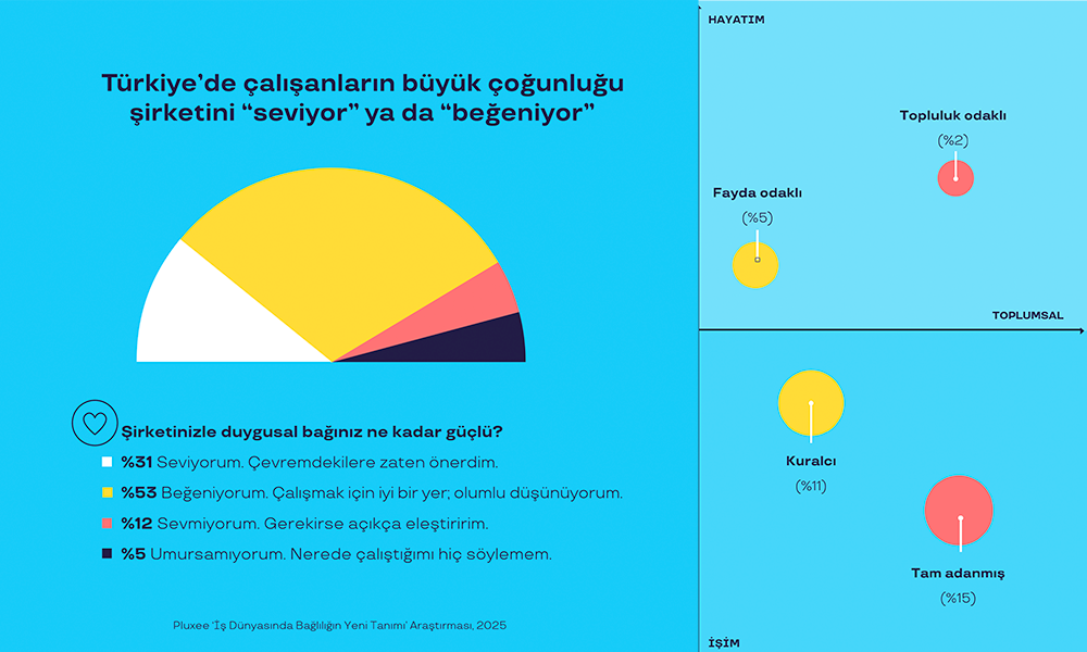 Türkiye’nin de aralarında bulunduğu Brezilya, İngiltere, Hindistan gibi farklı coğrafyalardan 10 ülkede, 8.700 çalışanın katılımıyla gerçekleştirilen araştırmaya göre, küresel olarak çalışanların %83’ü çalıştığı şirketi sevdiğini ya da olumlu hisler beslediğini ifade ediyor. Ancak bu bağlılık artık koşulsuz bir adanmışlık üzerinden değil; denge, anlam ve karşılıklı değer temelinde şekilleniyor.