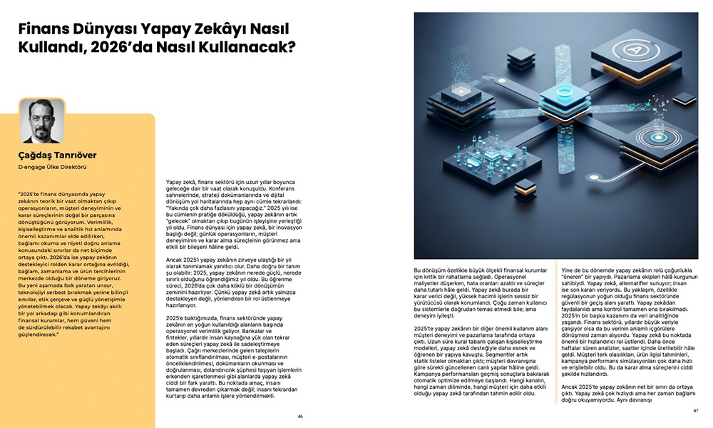 Dengage Ülke Direktörü Çağdaş Tanrıöver, Fintechtime Şubat 2026 sayısı için yazdı “2025’te Finans Dünyası Yapay Zekayı Nasıl Kullandı, 2026’da Nasıl Kullanacak?”.