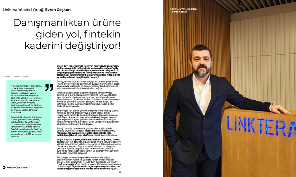 Danışmanlık birikimini ürünleşme vizyonuyla birleştiren Linktera, geliştirdiği Payify platformu ile bu dönüşümün altyapı tarafında konumlanıyor. Linktera Yönetici Ortağı Evren Coşkun ile Payify’ın mimari yaklaşımını, gömülü finans senaryolarını ve 2026 vizyonunu konuştuk.”