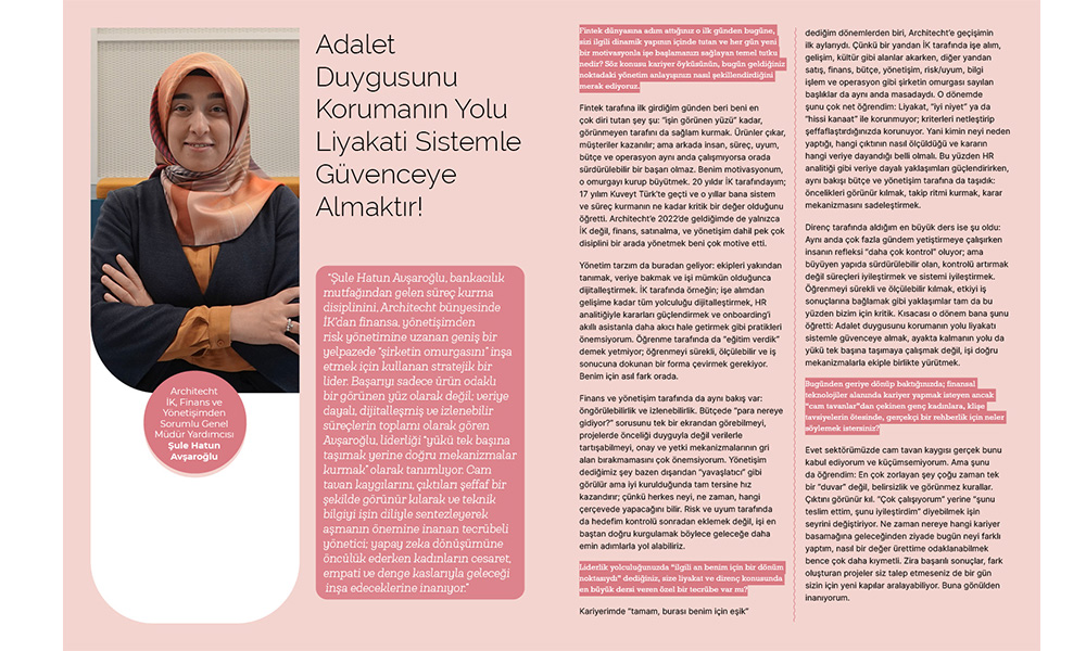 Architecht İK, Finans ve Yönetişimden Sorumlu Genel Müdür Yardımcısı Şule Hatun Avşaroğlu ile Fintechtime Mart 2026 sayısı “Fintek Dünyasının Mimarları” dosya konusu için gerçekleştirdiğimiz röportaj yayında.