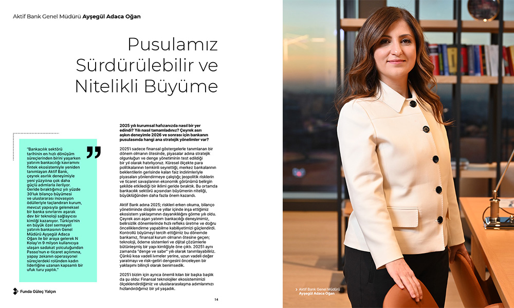 Yeni sayımızın kapağında, ekosisteme yön veren ve stratejileriyle dönüşüme öncülük eden çok değerli bir isim yer alıyor. Aktif Bank Genel Müdürü Ayşegül Adaca Oğan ile gerçekleştirdiğimiz kapak röportajında, finansal teknolojilerin rotasını çizen yenilikçi adımları ve geleceğin bankacılık anlayışını konuştuk. Kendisinin liderliği, ekosistemin tamamı için ilham verici ve ufuk açıcı bir referans noktası oluşturuyor.