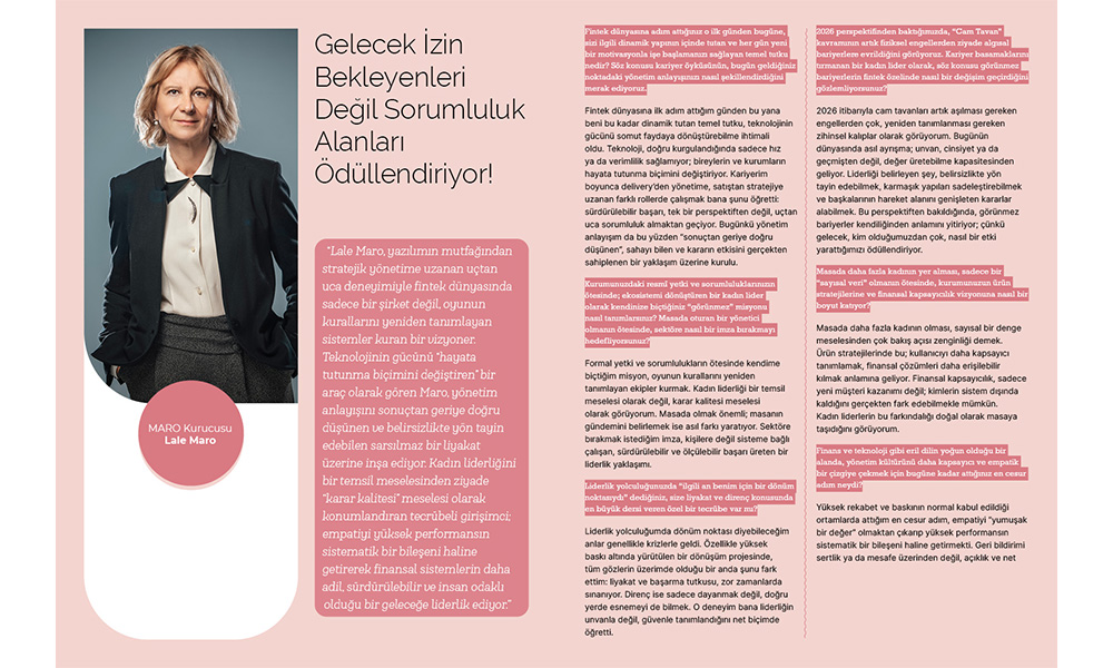 MARO Kurucusu Lale Maro ile Fintechtime Mart 2026 sayısı “Fintek Dünyasının Mimarları” dosya konusu için gerçekleştirdiğimiz röportaj yayında.