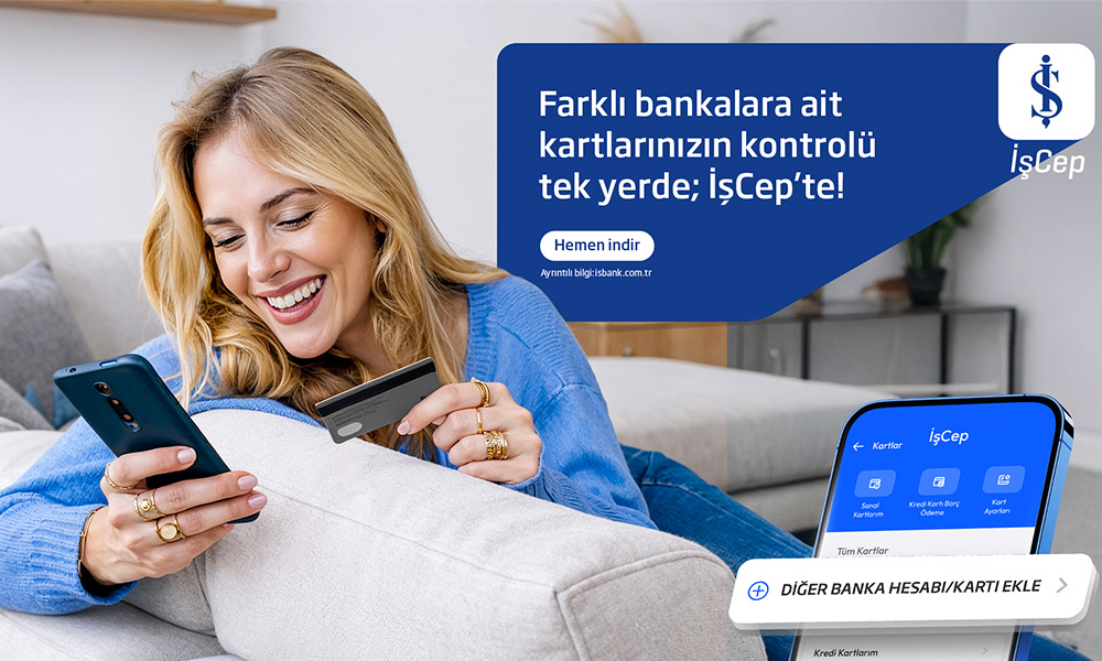 Daha önce devreye alınan açık bankacılık servisleriyle müşterilerine farklı bankalardaki vadesiz hesaplarını İşCep üzerinden yönetme imkânı sunan İş Bankası, yapılan son geliştirmeyle hizmet yelpazesine kartları da ekledi. Hayata geçirilen yeni özellik kapsamında; diğer bankalara ait kredi kartı, banka kartı, ön ödemeli kart, sanal kart ve dijital kartlar sisteme kolayca entegre edilebiliyor. Müşteriler, İşCep üzerinden verecekleri dijital onay ile diğer kurumlardaki kartlarını sisteme anında tanımlayabiliyor.