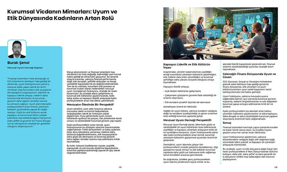 Mevzuat Uyum Derneği Başkanı Burak Şenol, Fintechtime Mart 2026 sayısı için yazdı “Kurumsal Vicdanın Mimarları: Uyum ve Etik Dünyasında Kadınların Artan Rolü”.