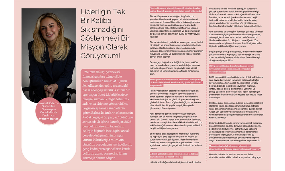 “Meltem Baltaş, geleneksel finansal yapıları teknolojiyle dönüştürürken mevzuat uyumu ile kullanıcı deneyimi arasındaki hassas dengeyi ustalıkla kuran bir operasyon lideri. Liderliği sadece bireysel uzmanlık değil, belirsizlik anlarında ekiplere yön verebilme ve güven aşılama sanatı olarak gören Baltaş, kadınların ekosistemin “doğal ve güçlü bir parçası” olduğunu sonuç odaklı işlerle kanıtlıyor. 2026 perspektifinde cam tavanların belirgin biçimde inceldiğini ancak gerçek dönüşümün kapsayıcı kurum kültürleriyle mümkün olacağını vurgulayan tecrübeli isim, genç kadın profesyonellerin kendi yollarını çizme cesaretine ilham vermeye devam ediyor.”