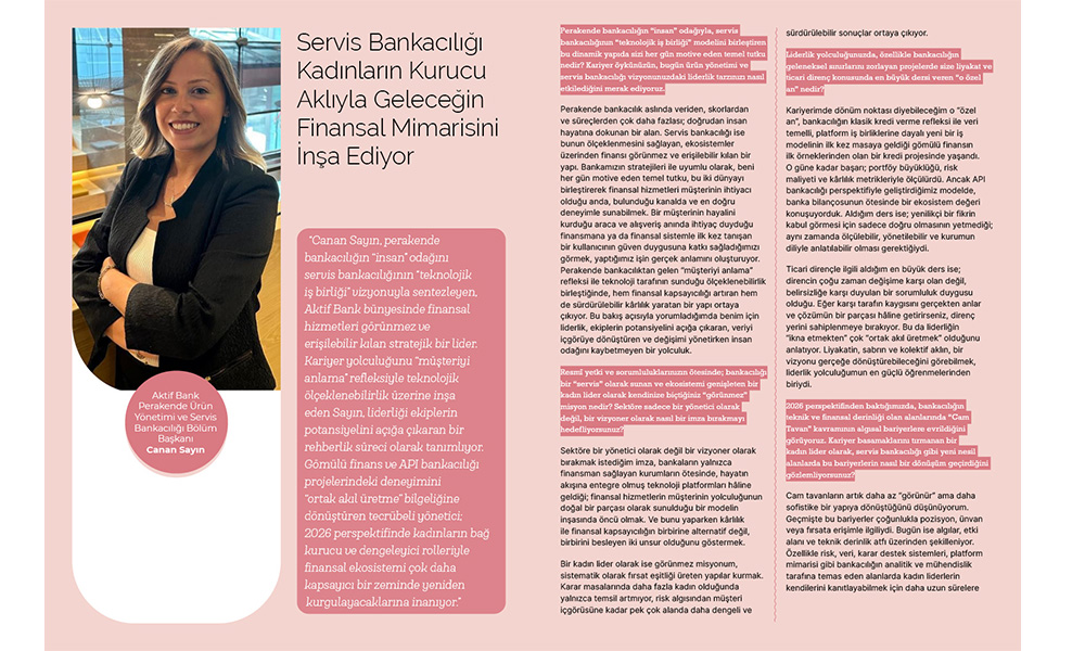 “Canan Sayın, perakende bankacılığın “insan” odağını servis bankacılığının “teknolojik iş birliği” vizyonuyla sentezleyen, Aktif Bank bünyesinde finansal hizmetleri görünmez ve erişilebilir kılan stratejik bir lider. Kariyer yolculuğunu “müşteriyi anlama” refleksiyle teknolojik ölçeklenebilirlik üzerine inşa eden Sayın, liderliği ekiplerin potansiyelini açığa çıkaran bir rehberlik süreci olarak tanımlıyor. Gömülü finans ve API bankacılığı projelerindeki deneyimini “ortak akıl üretme” bilgeliğine dönüştüren tecrübeli yönetici; 2026 perspektifinde kadınların bağ kurucu ve dengeleyici rolleriyle finansal ekosistemi çok daha kapsayıcı bir zeminde yeniden kurgulayacaklarına inanıyor.”