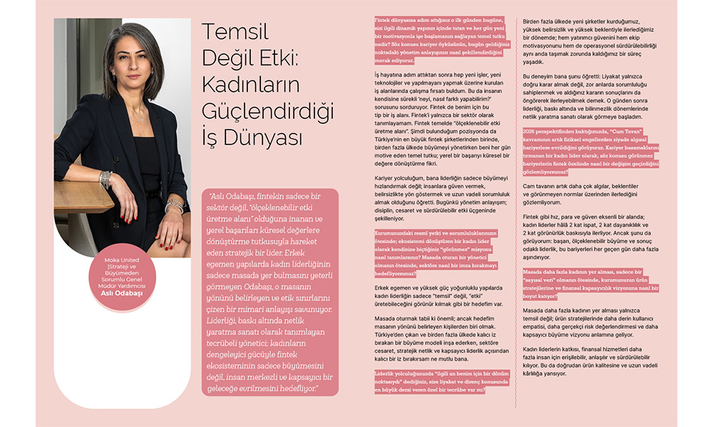 “Aslı Odabaşı, fintekin sadece bir sektör değil, “ölçeklenebilir etki üretme alanı” olduğuna inanan ve yerel başarıları küresel değerlere dönüştürme tutkusuyla hareket eden stratejik bir lider. Erkek egemen yapılarda kadın liderliğinin sadece masada yer bulmasını yeterli görmeyen Odabaşı, o masanın yönünü belirleyen ve etik sınırlarını çizen bir mimari anlayışı savunuyor. Liderliği, baskı altında netlik yaratma sanatı olarak tanımlayan tecrübeli yönetici; kadınların dengeleyici gücüyle fintek ekosisteminin sadece büyümesini değil, insan merkezli ve kapsayıcı bir geleceğe evrilmesini hedefliyor.”