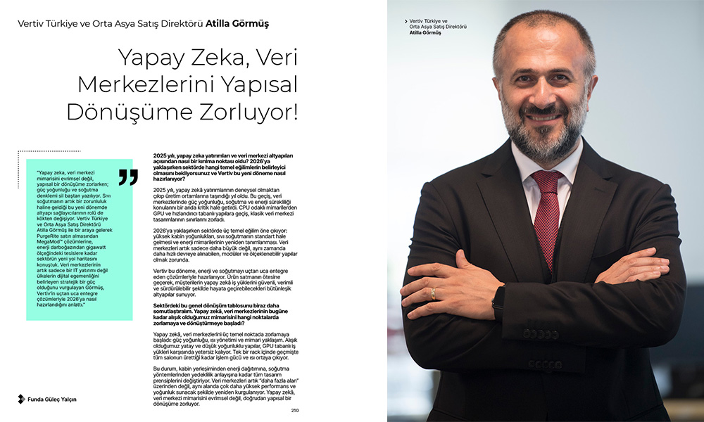 “Yapay zeka, veri merkezi mimarisini evrimsel değil, yapısal bir dönüşüme zorlarken; güç yoğunluğu ve soğutma denklemi sil baştan yazılıyor. Sıvı soğutmanın artık bir zorunluluk haline geldiği bu yeni dönemde altyapı sağlayıcılarının rolü de kökten değişiyor. Vertiv Türkiye ve Orta Asya Satış Direktörü Atilla Görmüş ile bir araya gelerek PurgeRite satın almasından MegaMod™ çözümlerine, enerji darboğazından gigawatt ölçeğindeki tesislere kadar sektörün yeni yol haritasını konuştuk. Veri merkezlerinin artık sadece bir IT yatırımı değil ülkelerin dijital egemenliğini belirleyen stratejik bir güç olduğunu vurgulayan Görmüş, Vertiv’in uçtan uca entegre çözümleriyle 2026’ya nasıl hazırlandığını anlattı.”