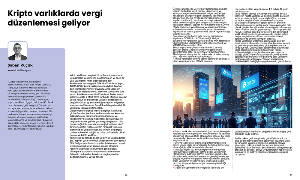 “Dijital ekonominin en dinamik katmanlarından biri olan kripto varlıklar, geçen ay başında Meclis’e sunulan yeni yasal düzenlemelerle birlikte net bir vergisel zemine kavuşacaktı. Fakat son anda düzenleme Genel Kurul aşamasında geri çekildi. Finansal teknolojilerin geleneksel bankacılık modellerini dönüştürdüğü bu süreçte, kripto varlıkların “gayrimaddi varlık” olarak tanımlanması; gelir vergisi stopajı ve işlem vergisi, KDV istisnası ve beyanname süreçlerinde belirsizliklerin sona erdiği yeni bir dönemi başlayacaktı.