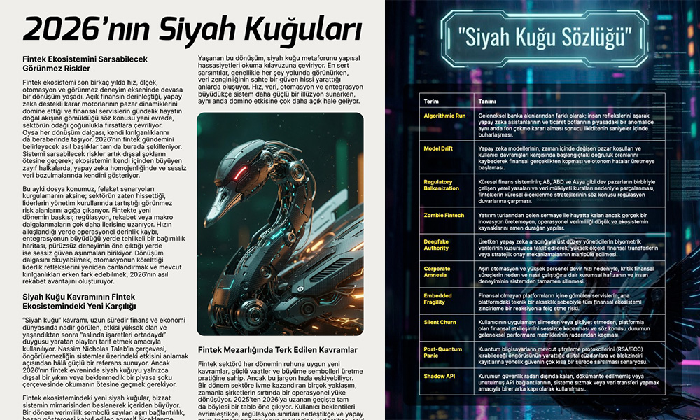 Fintechtime olarak her yıl büyük bir heyecanla hazırladığımız özel dosyalarımızda bu kez odağımızı; başarı göstergelerinin arkasına saklanan, dışsal şokları aşarak ekosistemin tam kalbinde büyüyen görünmez risklere çevirdik. “Liderlerin Gözünden 2026’nın Siyah Kuğuları” başlığı altında, hızın alkışlandığı yerde oluşan operasyonel zafiyetleri, yapay zeka monokültürünün yarattığı tek tipleşme tehlikesini ve birbirine bağlı küçük hataların doğurduğu zincirleme etkileri mercek altına aldık.