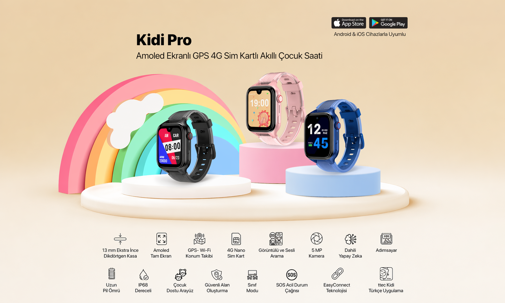 Kidi Pro, dahili GPS, LBS, A-GPS, Wi-Fi ve sensörleri sayesinde anlık ve hassas konum takibi sunarak ailelerin içinin her zaman rahat olmasına yardımcı oluyor. 4G Nano SIM kart desteği ve EasyConnect teknolojisi sayesinde görüntülü ve sesli aramalar gerçekleştirilebilirken, tek tuşla aktifleşen SOS acil durum çağrısı hızlı konum bildirimi yapılmasını sağlıyor. Tek şarjla 2 güne kadar pil ömrü sunan saat, şarj azalması gibi kritik bildirimlerin yanı sıra güvenli alan oluşturma ve takip özellikleriyle çocukların güvenli kullanımını destekliyor.